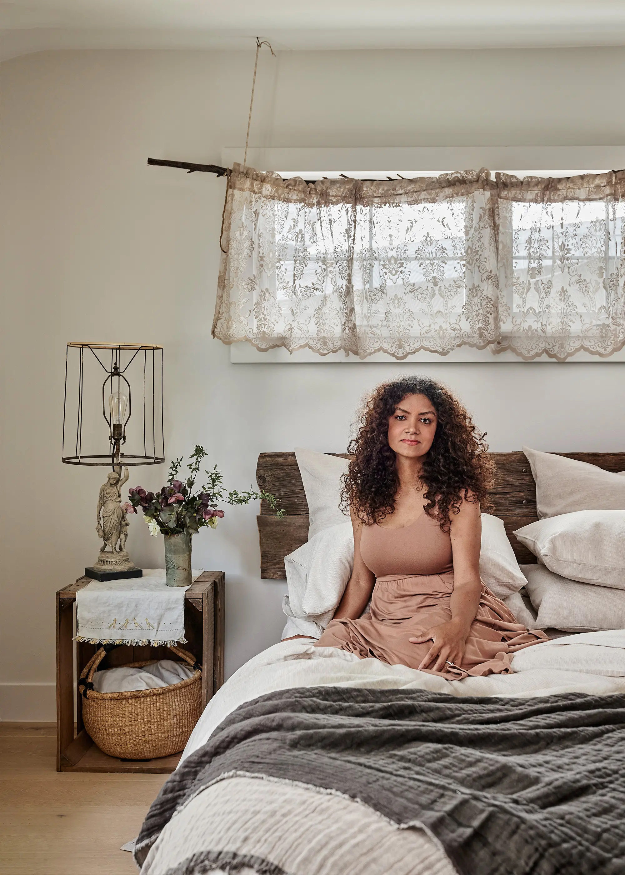 Karen’s “specific eye” has a flair for the details, too. In the bedroom, tree branches replace traditional curtain rods, and mismatched lamps and bedsides add depth and texture to the space. “I definitely love creating calming spaces in the bedroom, with minimalist bedding and lighter creamier colours, like my Bed Threads Oatmeal linens. And you can get creative with your bedframe – it doesn’t all have to be matchy. When you’re putting your spaces together, just do what speaks to you. You can’t go wrong with that.”