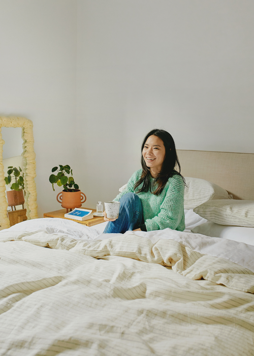 Her favourite furniture item is her bedroom set, which was made from honey-hued wood by designer Milo Baughman for Lane Furniture – a gorgeous match for Bed Threads Olive and Oatmeal linen. The set is beautiful and eye-catching, but it also simply does its job. “Think about function,” Midtbo advises, when it comes to decorating your home. “I like to place things where they make sense. I want to use and touch every piece of furniture in my house.”