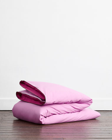 Discover crisp, smooth, 100% organic cotton in Berry, Bubblegum & Moss – featuring contrast piping and reversible colourways.
