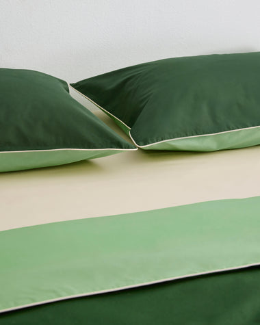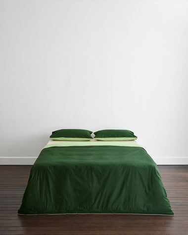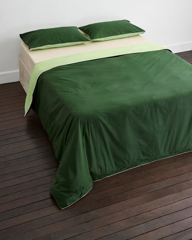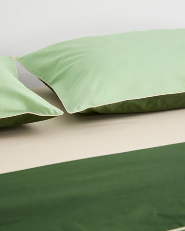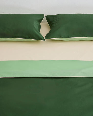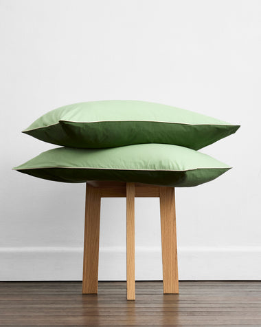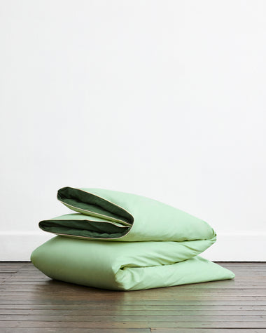Discover crisp, smooth, 100% organic cotton in Moss, Apple & Vanilla – featuring contrast piping and reversible colourways.
